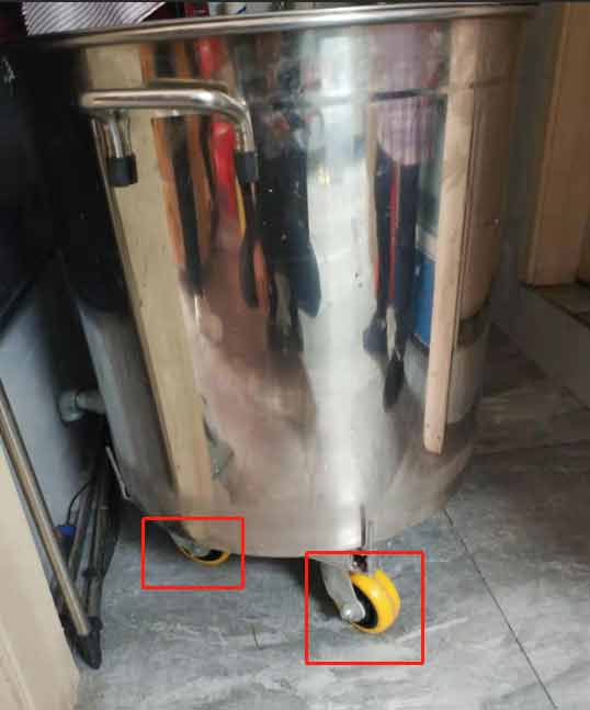 这是一家面馆用来煮面的不锈钢开水桶,在这桶底部的轮子,就是脚轮。这家面馆由于在开水桶下面安装了脚轮,使得面馆的经营范围变大。